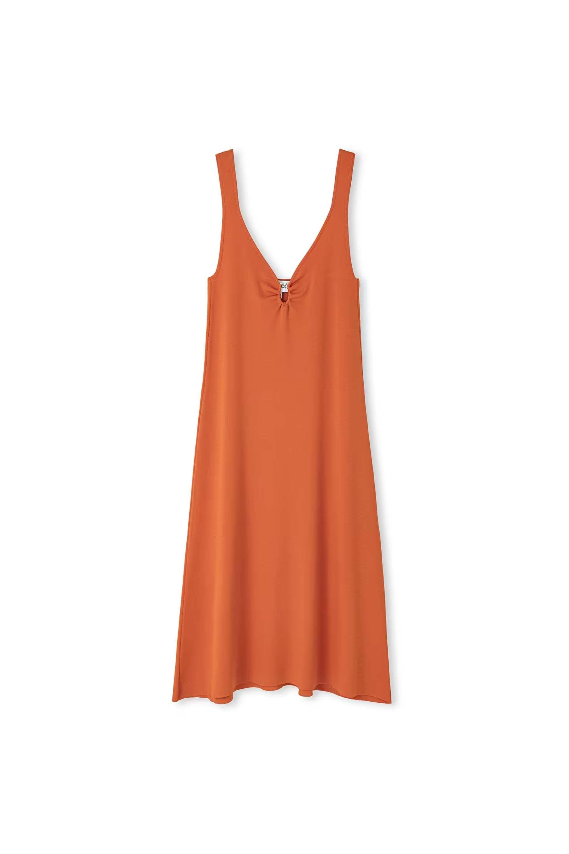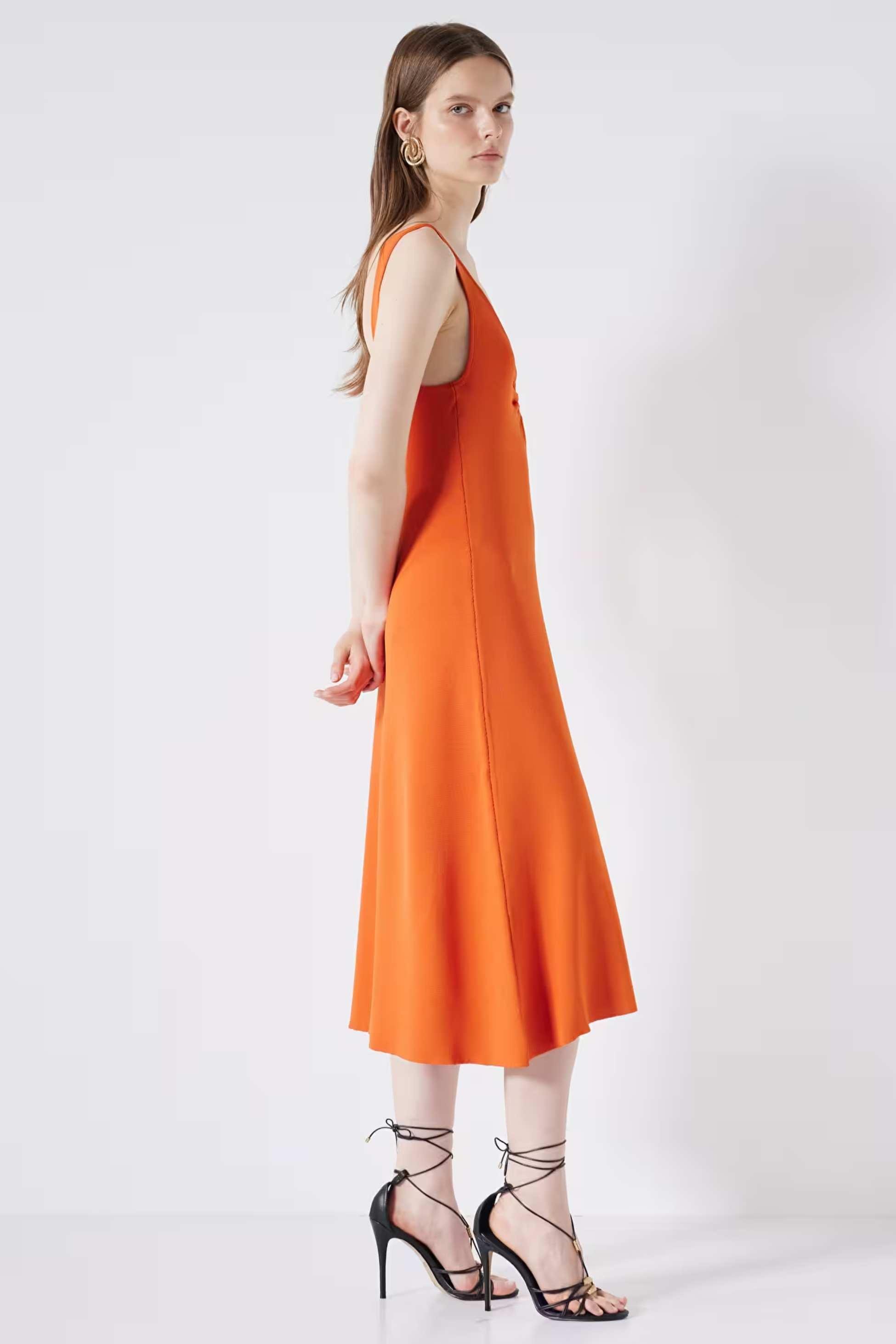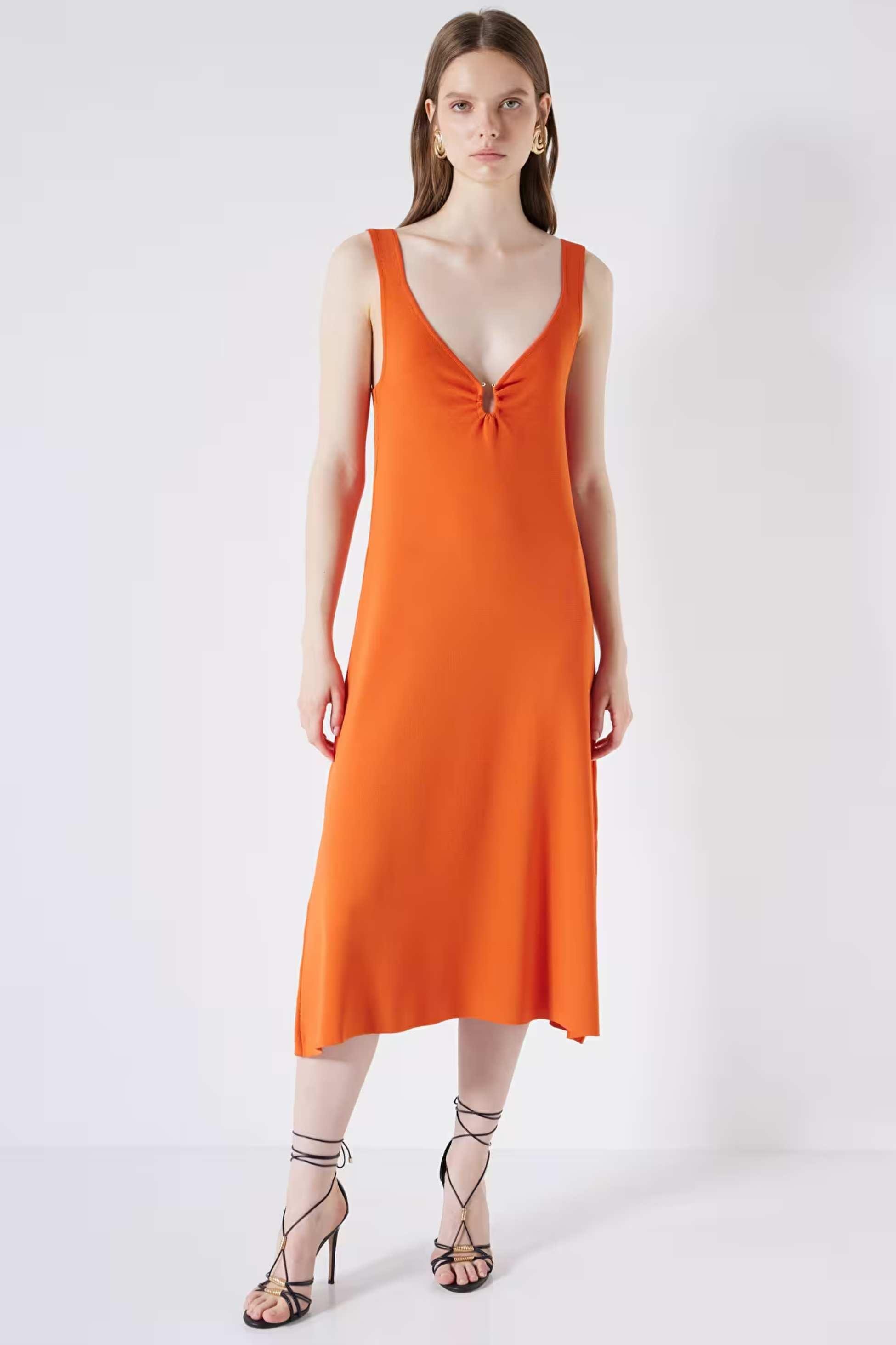 Zarif bir görünüm sunan triko elbise, yalın duruşuna eklenen metal aksesuarı ile fark yaratıyor. Düz kesim elbiseyi zarif topuklu ayakkabılarla kombinleyerek ofis; sneaker'larla kombinleyerek günlük stilinize adapte edebilirsiniz.