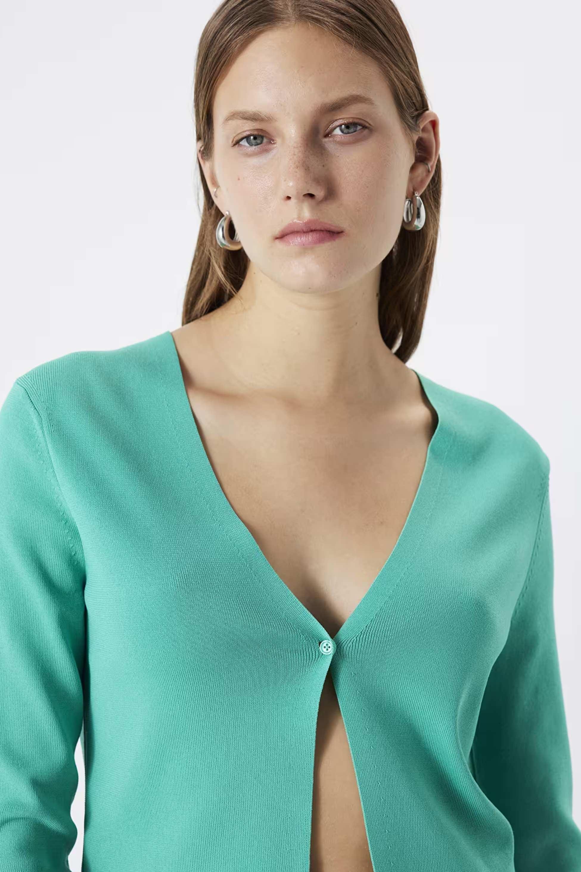 Minimal tasarım çizgisi ile ilkbahar-yaz sezonunda kurtarıcı olacak bir parça. Ön panelinde tek düğme aksesuarı ile detaylanan hırkayı pantolon ve eteklerin üzerinde rahatlıkla kombinleyebilirsiniz.