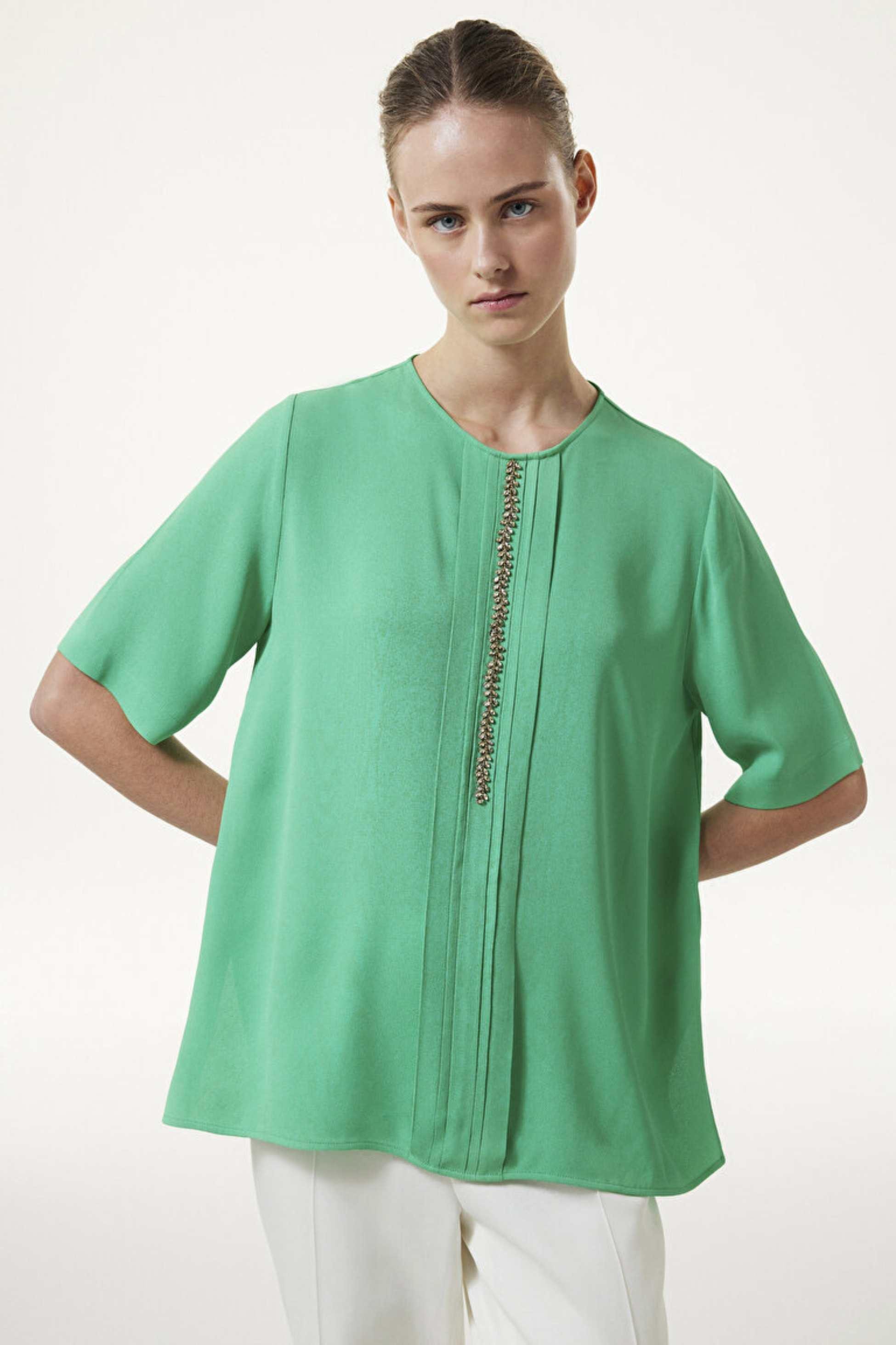 Sezon trendi rengi ile ilk bakışta dikkat çeken bluz, işlemeleri ile Machka dokunuşu kazanıyor. Etek ucundaki yırtmaçlarla hareket kazanan bluz, rahat kesimi sayesinde konforlu bir duruşa imza atıyor.