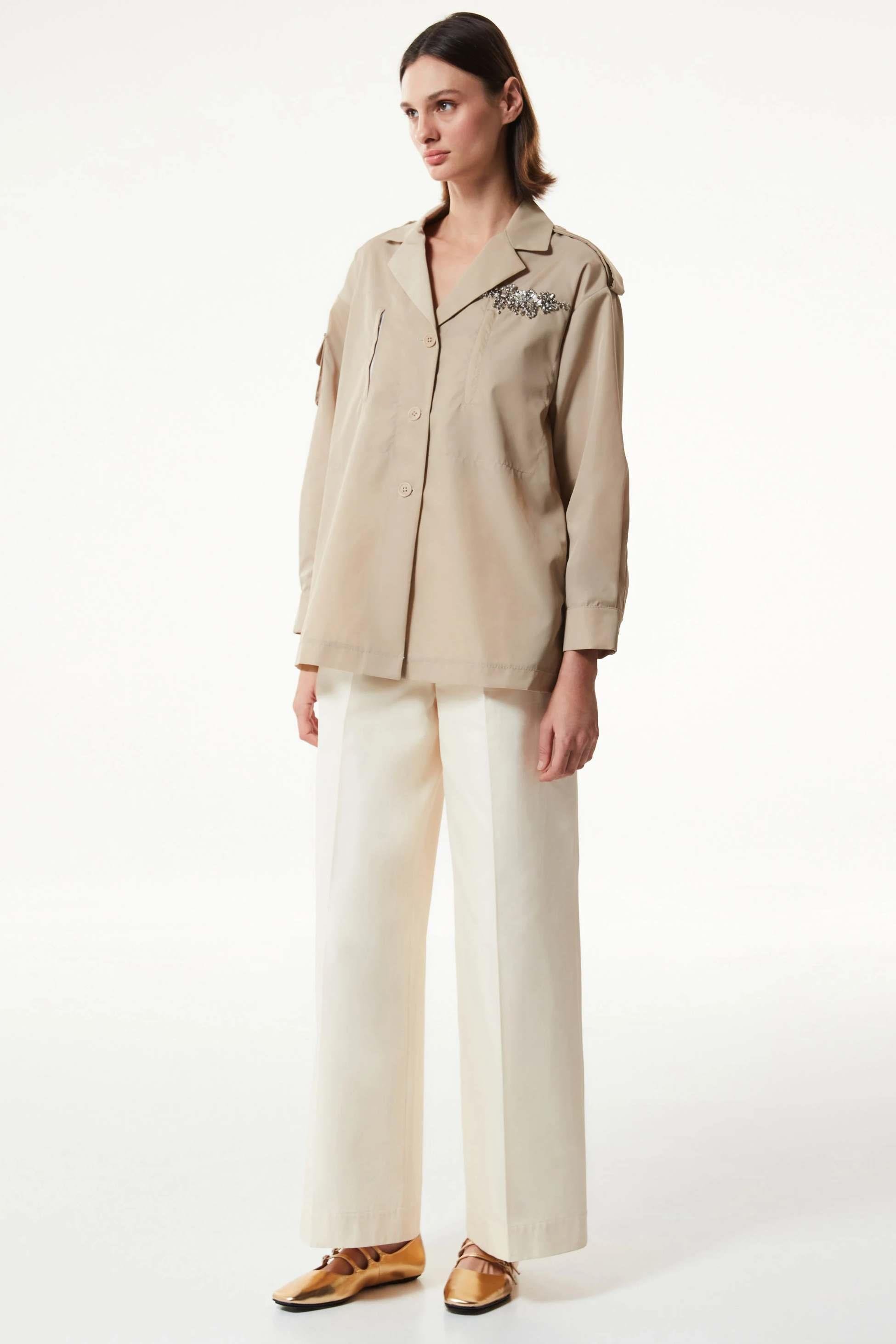 Geçiş mevsimi boyunca kurtarıcı olacak bir parça. Taş işlemesi ile ışıltının dozunu artırırken; cepleri ile fonksiyonel kullanım sunan apoletli montu gardırobunuza mutlaka ekleyin.