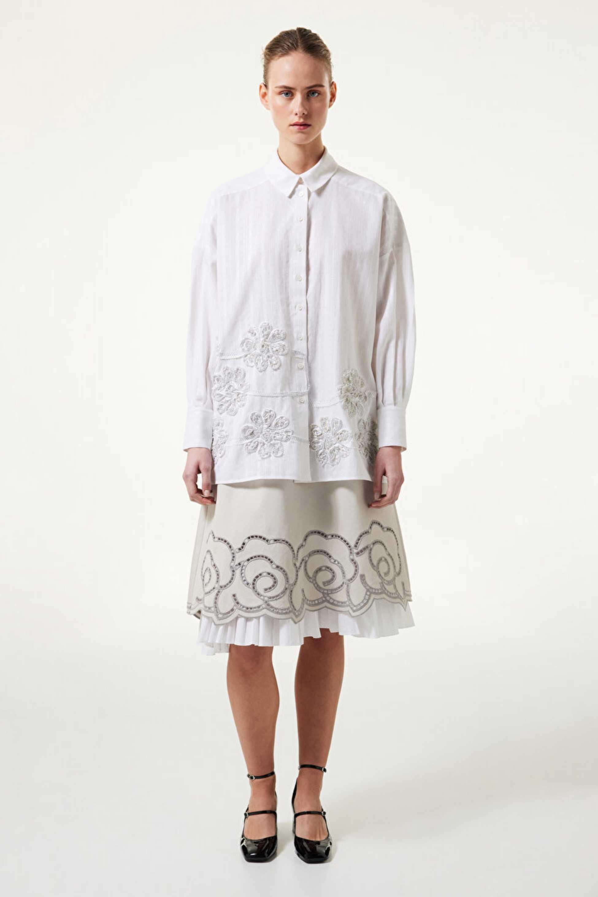 Pamuk ve keten karışımlı dokusu ekseninde mevsim gardırobuna hızla adapte olan bir parça. Nakış işlemeleri zarif bir şıklığa imza atan tuniği yüksek bel pantolon ve eteklerle tamamlayabilir; kombine son dokunuşu minimal aksesuarlarla yapabilirsiniz.