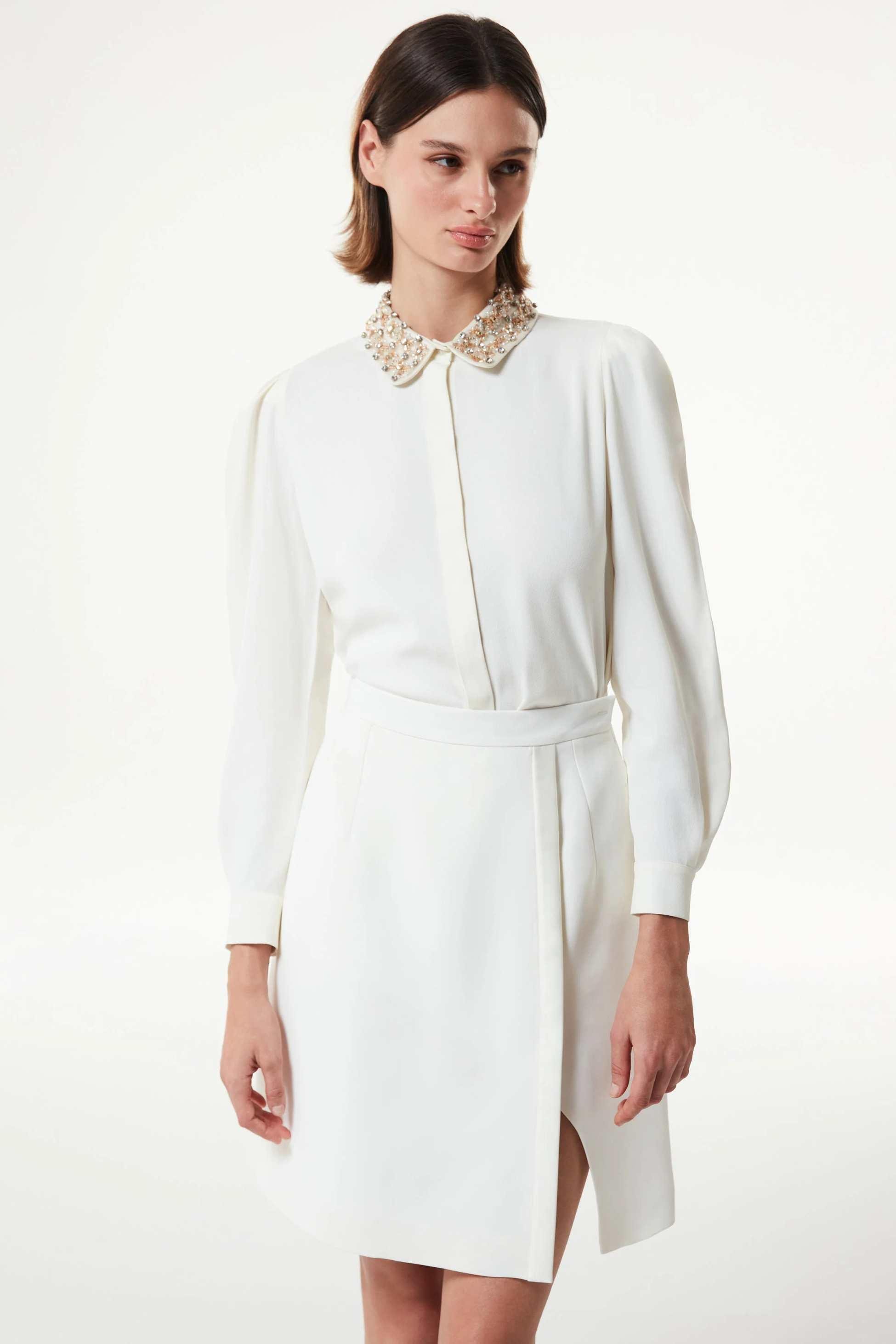 Yalın ve minimal duruşuna eklenen taş işlemeleri ile iddialı bir kimlik kazanan gömlek gizli patı ile detaylanıyor. Rahat kesim gömleği klasik kesim etek veya pantolonlarla kombinleyerek mevsim stilinize adapte edebilirsiniz.