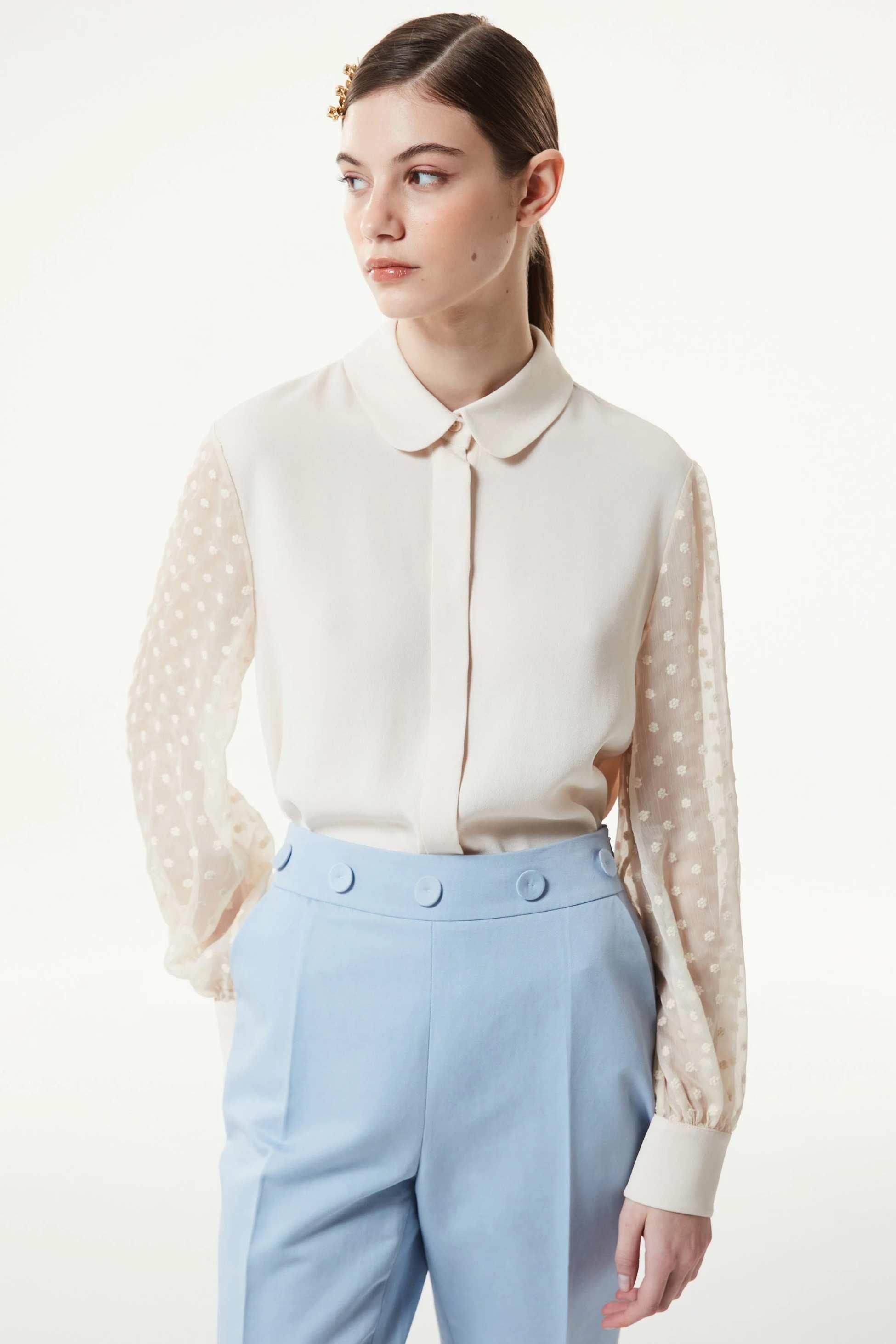 Yalın ve minimal duruşuna eklenen nakışlı kumaş mix'i ile hareket kazanan gömlek gizli patı ile detaylanıyor. Rahat kesim, bebe yaka, krep gömleği klasik kesim etek veya pantolonlarla kombinleyerek mevsim stilinize adapte edebilirsiniz.