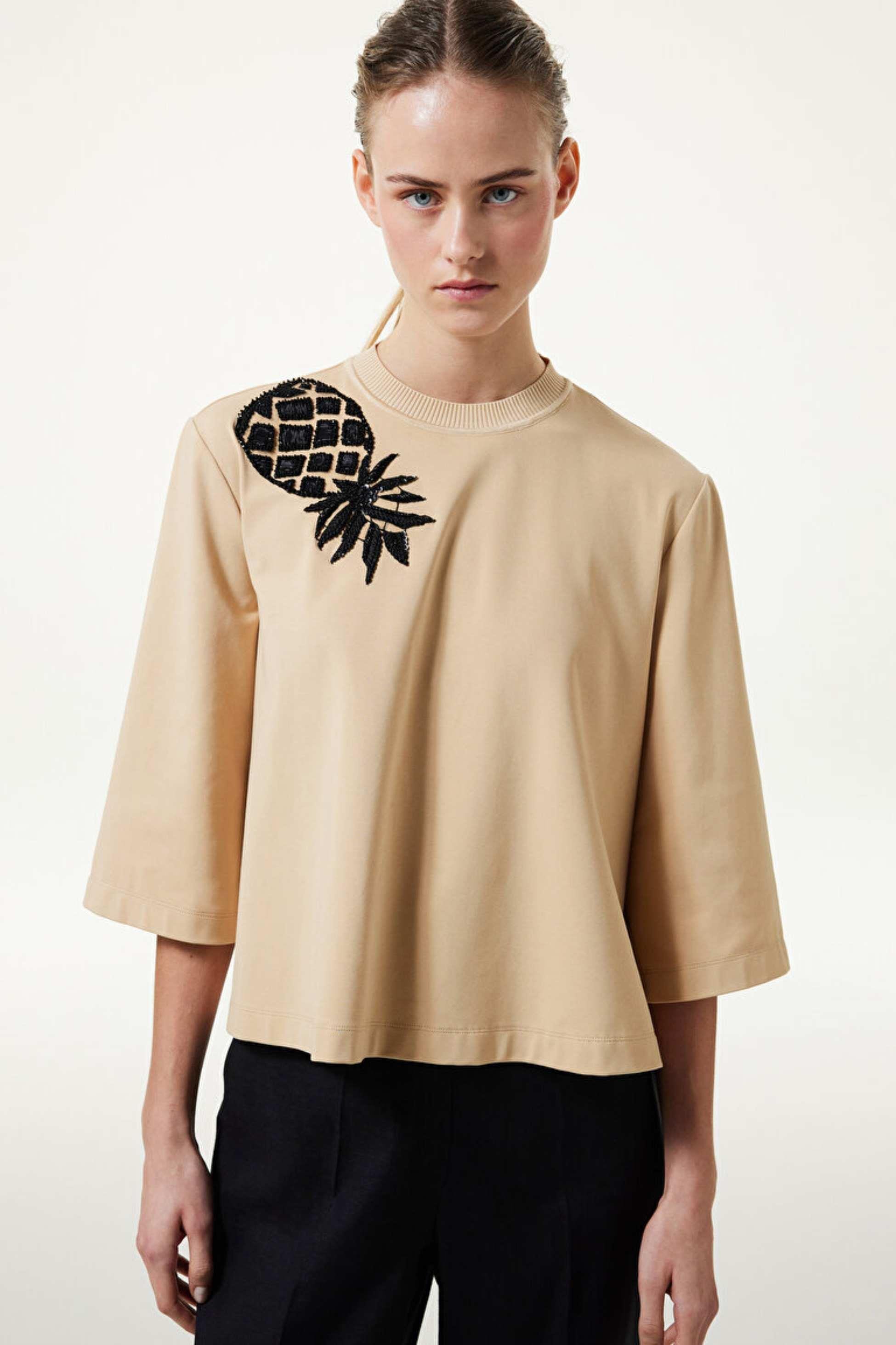 Mevsimin pozitif ruhunu yansıtan tasarım ögeleri Machka'nın ilham veren dünyasına adapte oluyor. Pamuk karışımlı tişört, rahat kesimi sayesinde konforlu bir duruş vadediyor.