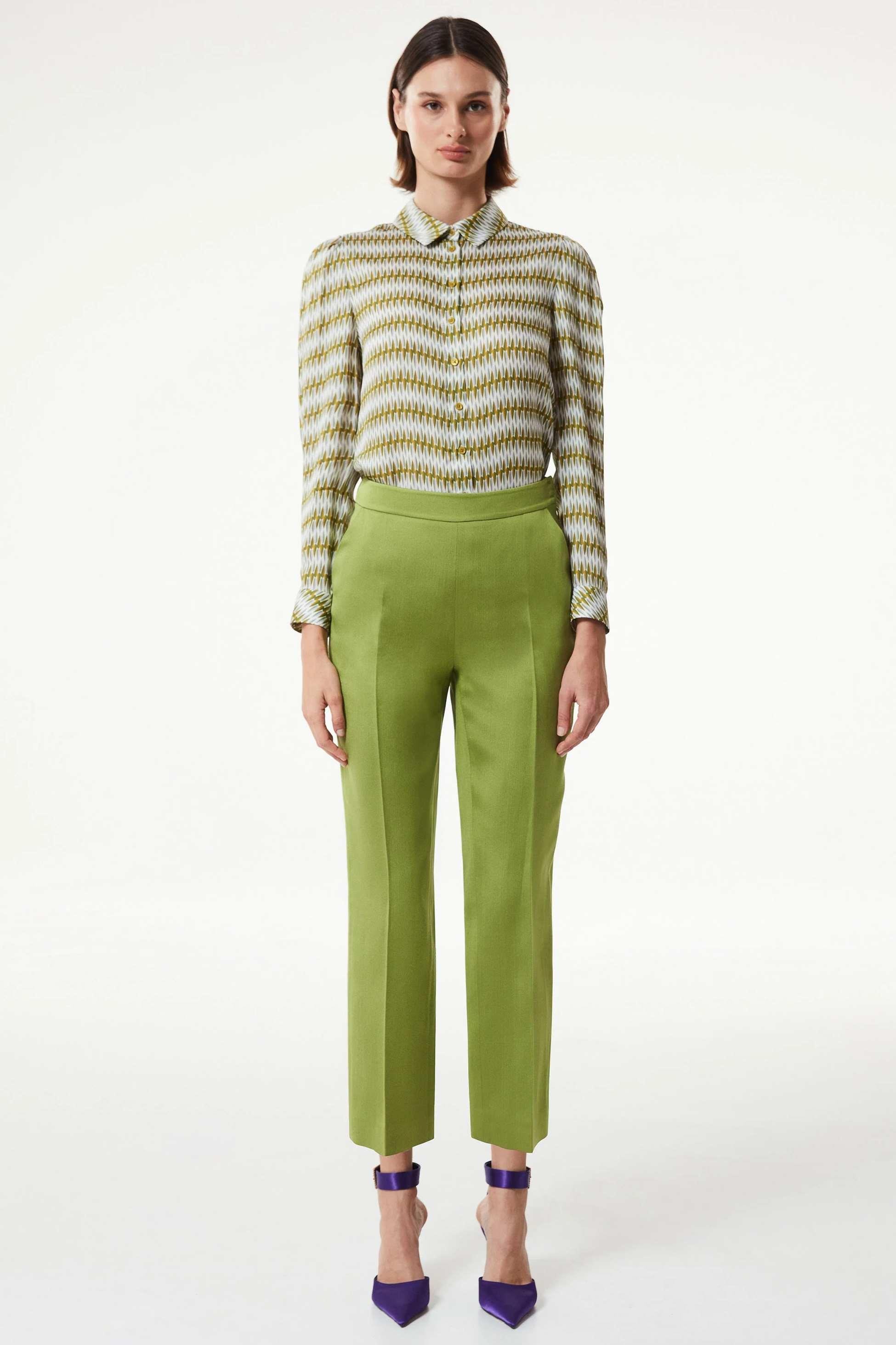 Sezon trendlerini yansıtan rengi ile iddialı bir duruşa imza atan pantolon, kumaşı sayesinde rafine stil algısını güçlendiriyor. Cigarette fit pantolonu desenli gömlek veya bluzlarla tamamlamayı deneyin.