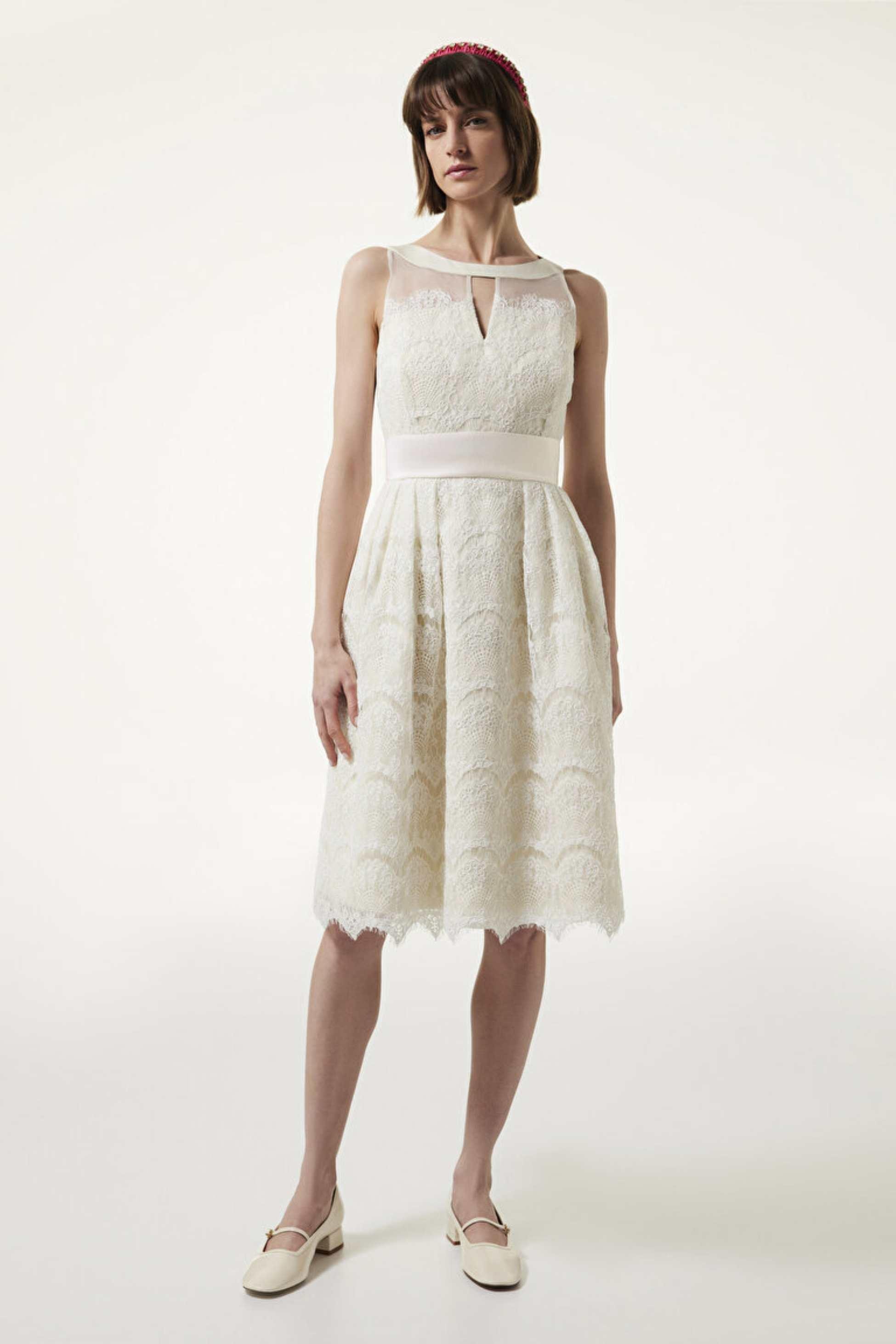 Gardırop klasikleri, Machka dokunuşlarıyla romantik ve feminen bir silüet kazanıyor. Bele oturan kalıbı ile vücut formunu vurgulayan ten rengi astarlı elbiseyi zarif topuklu ayakkabılarla tamamlayarak davet stilinize adapte edebilirsiniz.