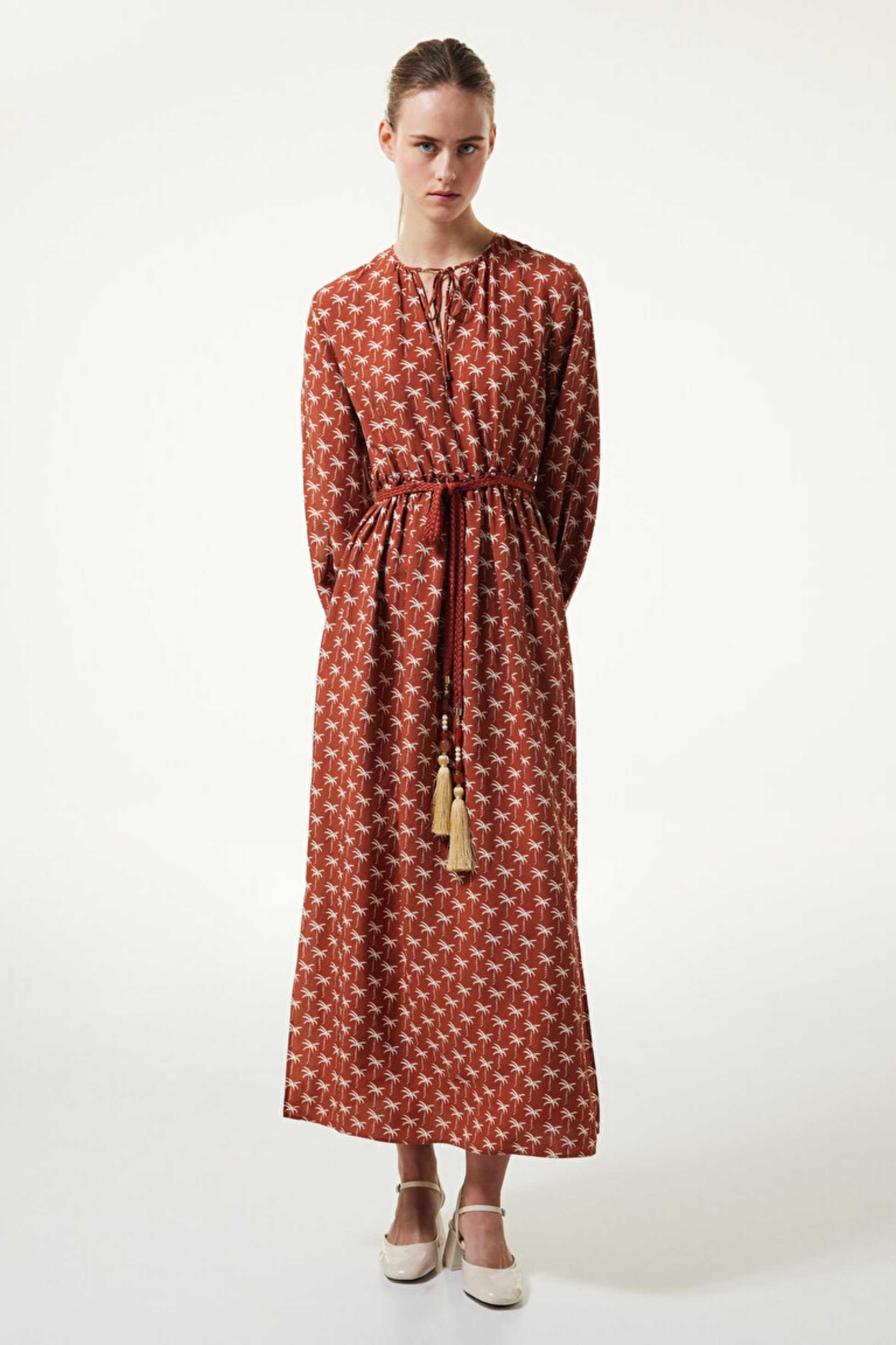 Deseni ile mevsimin pozitif ruhunu yansıtan elbise, giy-çık konforu sunuyor. Püsküllü örgü kemeri ile bel hattını vurgulayan maksi elbise, bağlanabilir yakası ile detaylanıyor.