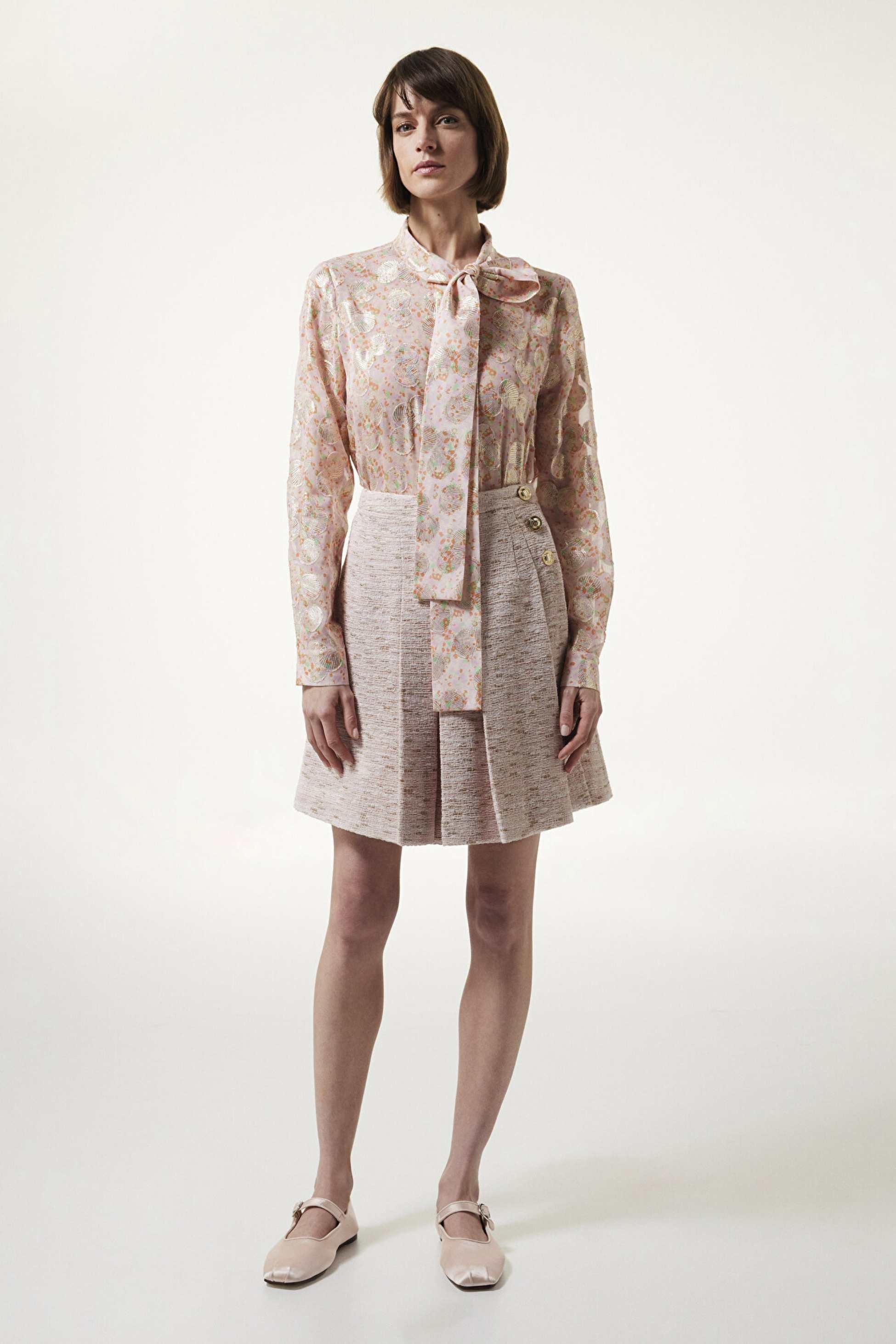 Modası hiçbir zaman geçmeyen tüvit dokular, Machka dokunuşu ile asil bir görünüme imza atıyor. Pileli mini etek, takımı olan ceketle kombinlendiğinde bütünlüklü bir şıklık vadediyor.