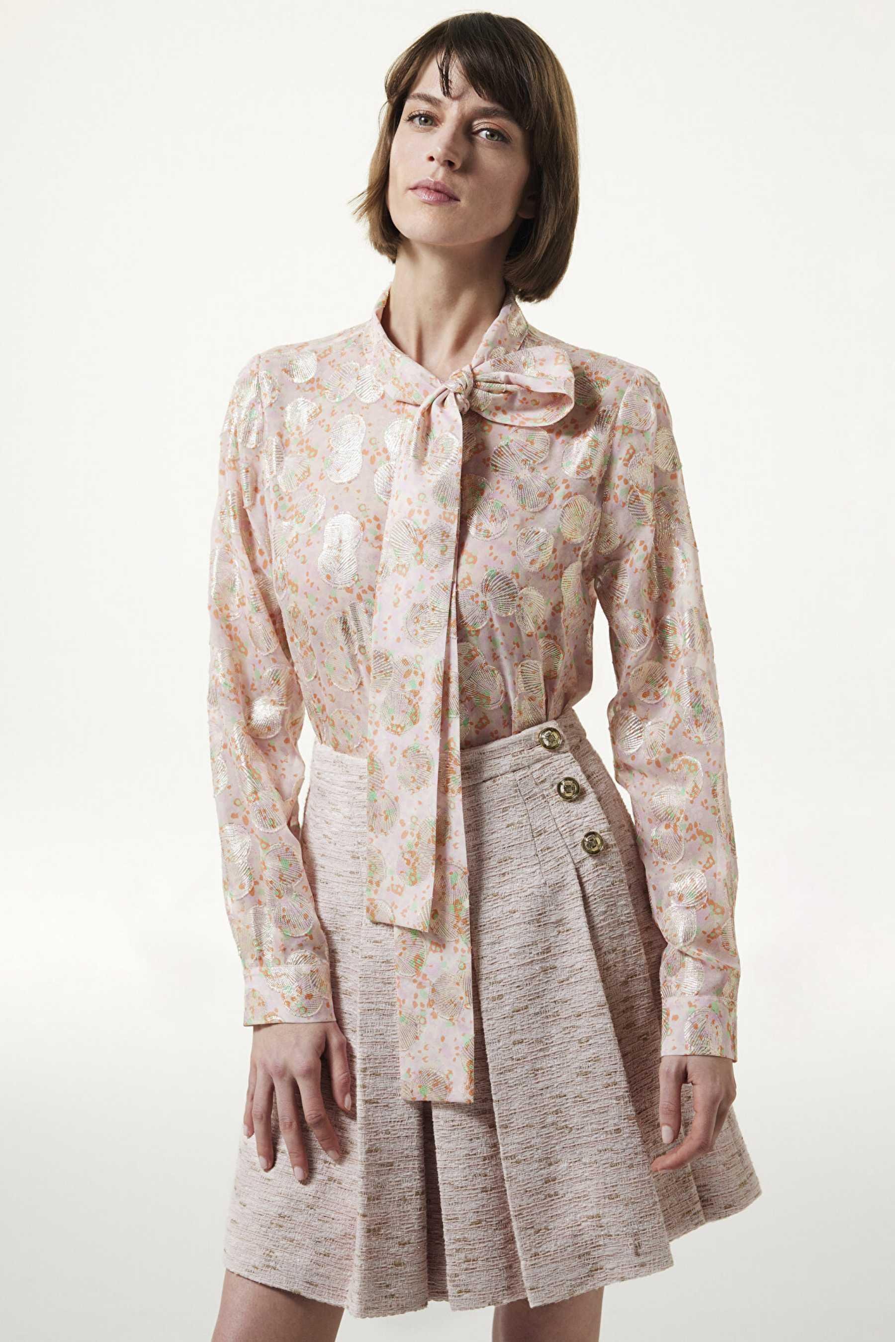 İlkbahar-yaz sezonunun nahif renk paleti ve desen dünyası ekseninde stil oyununa dahil olan bir parça. Fular efektli, rahat kesim bluzu yüksek bel pantolon veya eteklerle tamamlamayı deneyin.