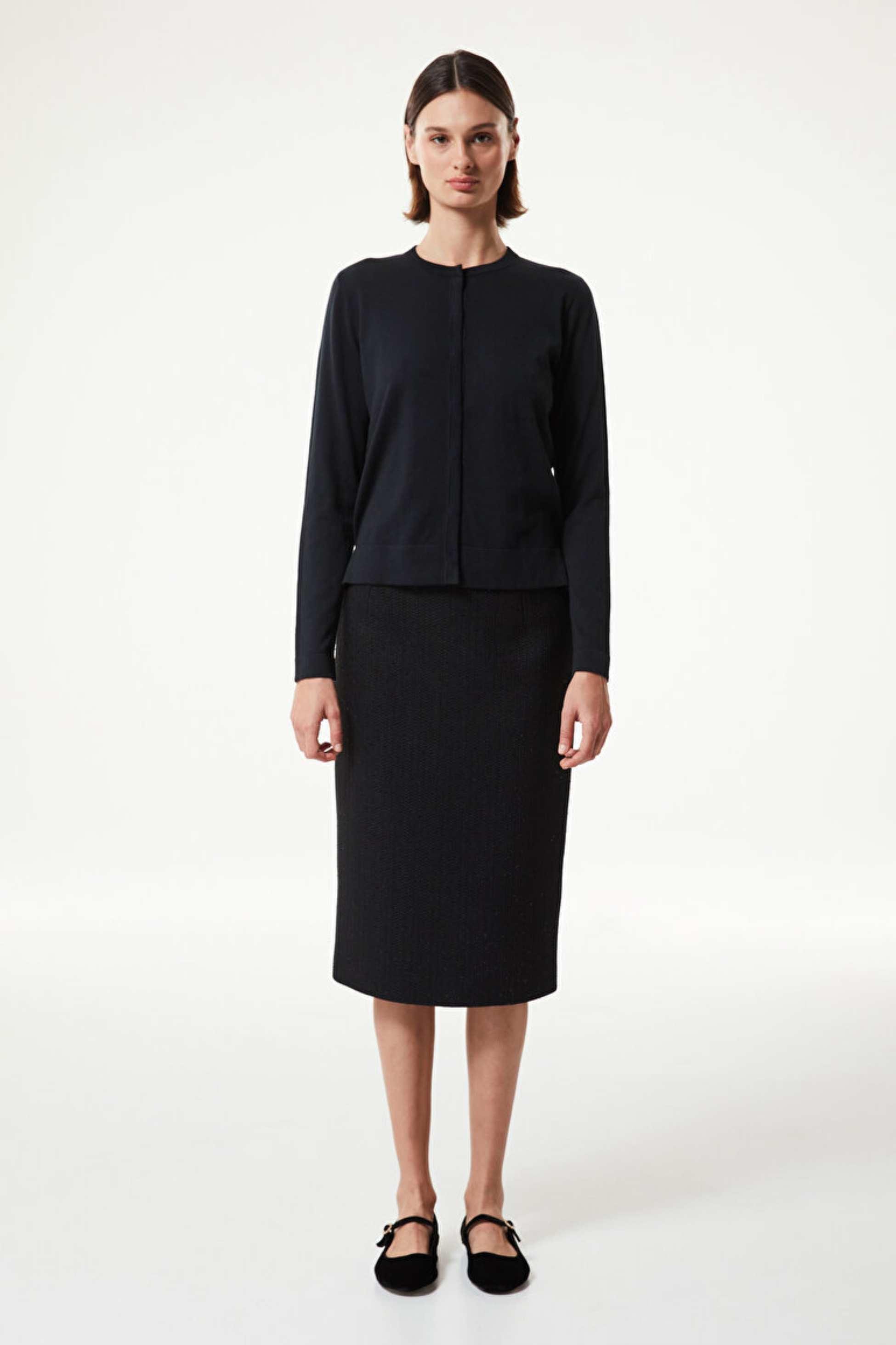 Basic duruşuna eklenen işlemelerle zarafetin yeni tanımını yapan kalem etek, mevsim görünümlerine ışıltılı bir tavır katıyor. Dar kesim eteği basic trikolarla kombinleyerek rafine; işlemeli bluzlarla kombinleyerek daha iddialı bir silüet elde edebilirsiniz.