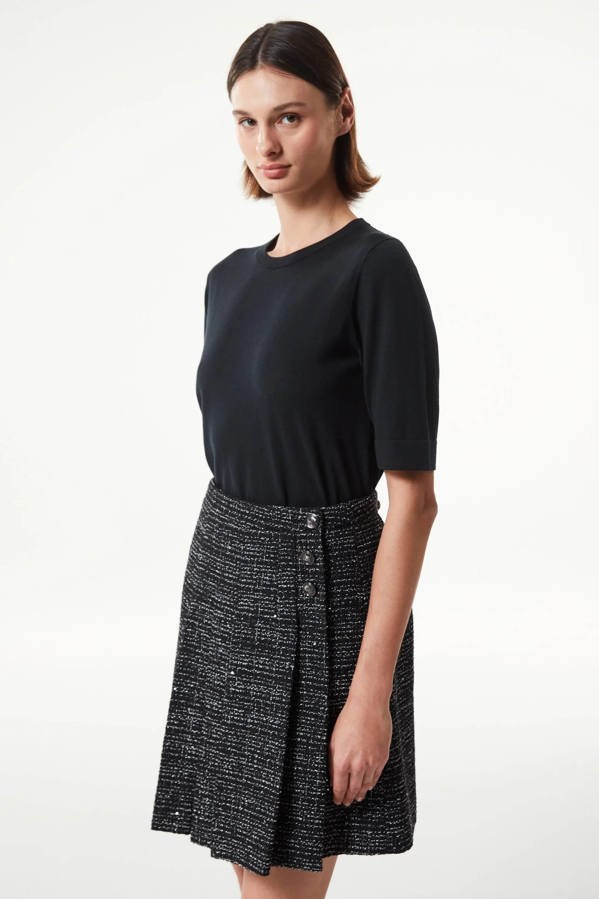 İkonik dokusu ile rafine bir şıklığın izini süren mini etek, pileleri ve düğme aksesuarları ile hareketleniyor. Mini eteği basic triko veya bluzlarla kombinleyerek bütünlüklü bir görünüm elde edebilirsiniz.