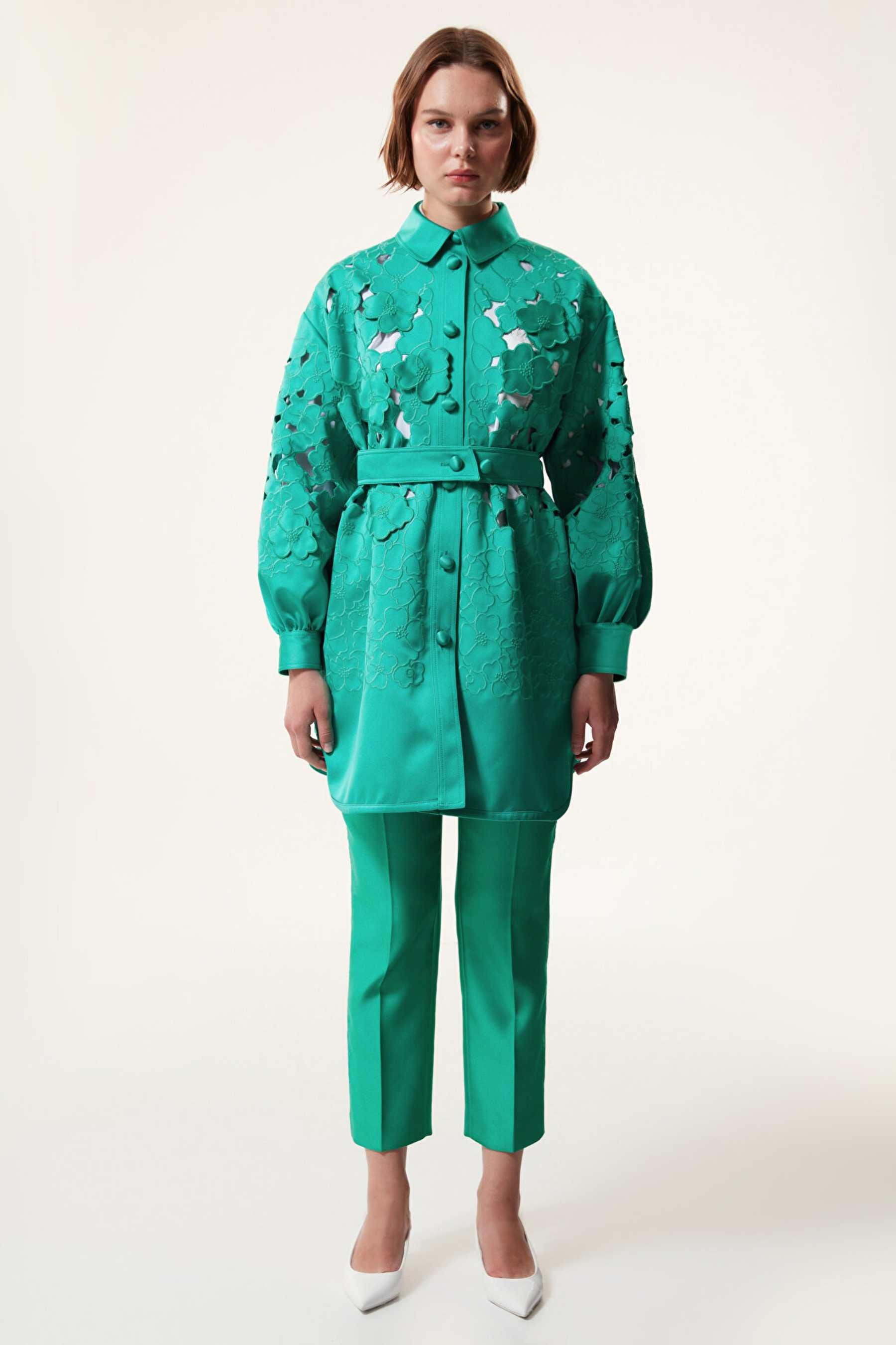Geçiş mevsiminin favori pardösülerine Machka dokunuşu...|Çiçek nakışları ile romantik bir silüet yaratırken; düğmeli kuşağı ile bel formunu vurgulayan pardösü sezon stilinin anahtar parçalarından olmaya aday.